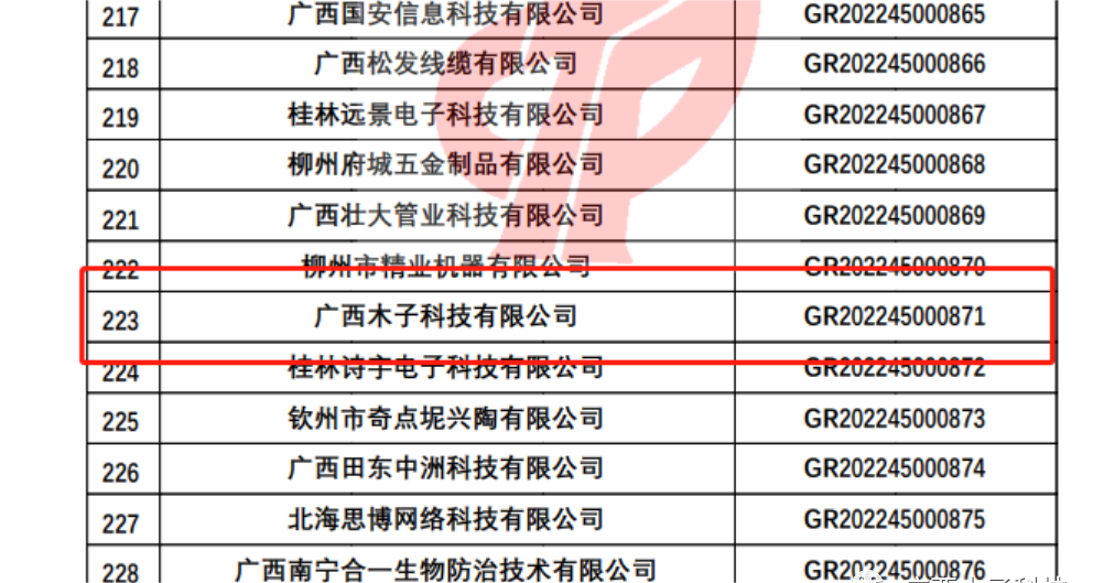 2022年12月19日,廣西木子科技有限公司通過了全國高新技術(shù)企業(yè)認(rèn)定,正式成為全國高新技術(shù)企業(yè)中的一員
